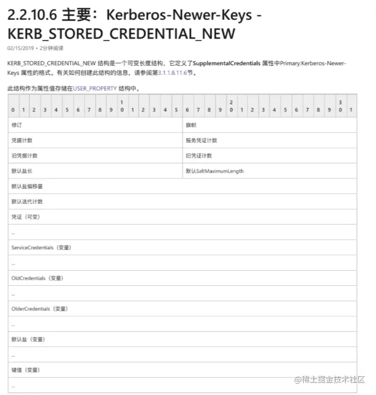 其中在WIN2008及其更新的版本中必须创建一个KERB_STORED_CREDENTIAL_NEW结构体。然后必须将此值 与属性名称“Primary:Kerberos-Newer-Keys”一起放置在USER_PROPERTY结构中才能放在补充凭据中使用,USER_PROPERTY如下图