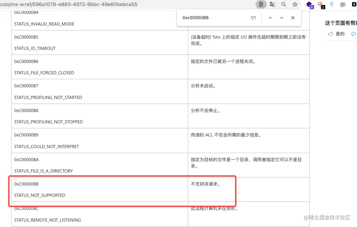 通过微软官方文档查询报错值发现是不支持该请求类型的错误STATUS_NOT_SUPPORTED,keberos认证流程中客户端会在AS-REQ中声明自己支持的所有加密类型etype,域控会并检查客户端是否支持AES如果客户端支持则域控会在AS-REP的PA-ETYPE-INFO2中响应对应的加密方式。但如果客户端支持的加密类型中有AES,但DC并没有回应对应的AES加密类型,并且报错类型是STATUS_NOT_SUPPORTED很大可能受到了skeleton攻击