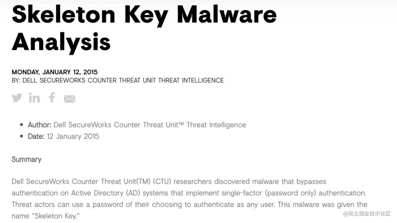 2015年1月2日,Dell Secureworks共享了一份关于利用专用域控制器(DC)恶意软件(名为“SkeletonKey”恶意软件)进行高级攻击活动的报告,SkeletonKey恶意软件修改了DC的身份验证流程,域用户仍然可以使用其用户名和密码登录,攻击者可以使用Skeleton Key密码作为任何域用户登录