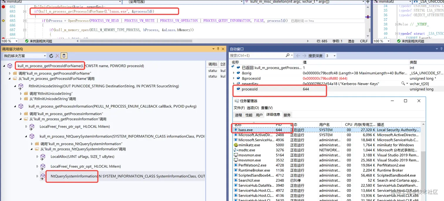 接下来传入lsass.exe到kull_m_process_getProcessIdForName函数中用来获取lsass进程的pid,该函数主要通过NtQuerySystemInformationAPI函数来获取