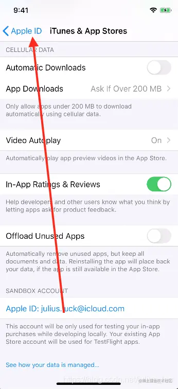 对于iOS12或更高版本,从Xcode构建并运行应用程序。首次使用设备尝试购买具有开发签名的应用程序后,“设置”中的沙盒帐户将会被显示。可以使用沙盒Apple ID登录。无需注销非测试Apple ID。