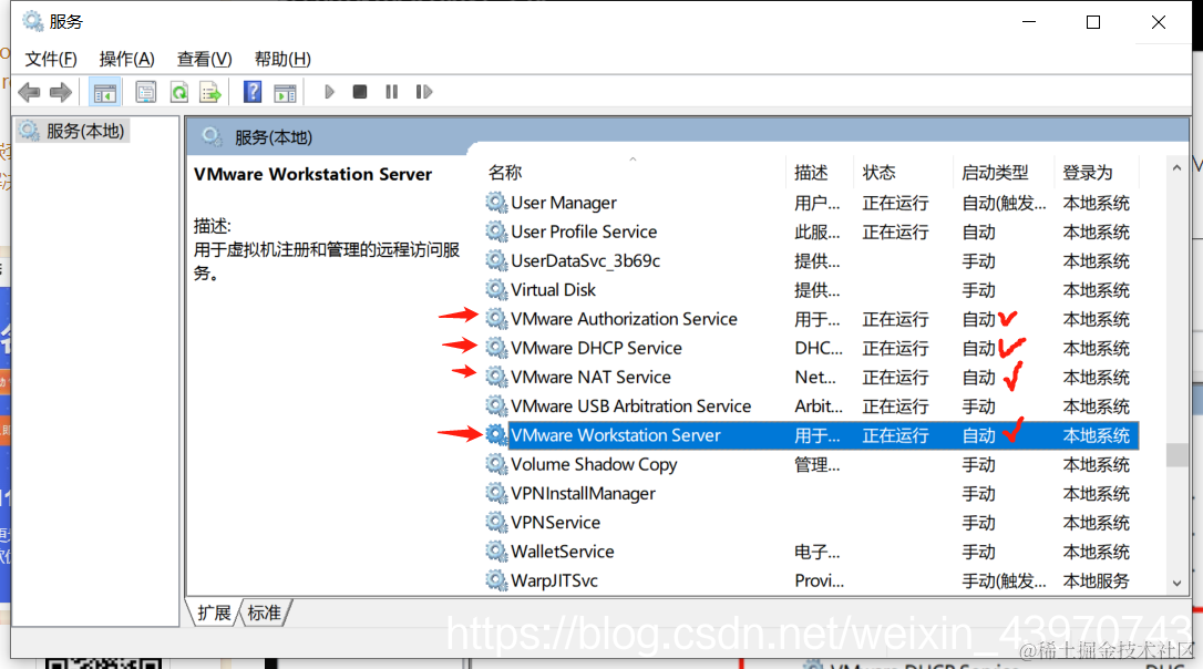 1、先查看下你电脑有没有禁用了VMware DHCP service、VMware Workstation Service、VMware NAT service 这几个vm服务,如果禁用了则开启并设置自动。确保这三服务开启;