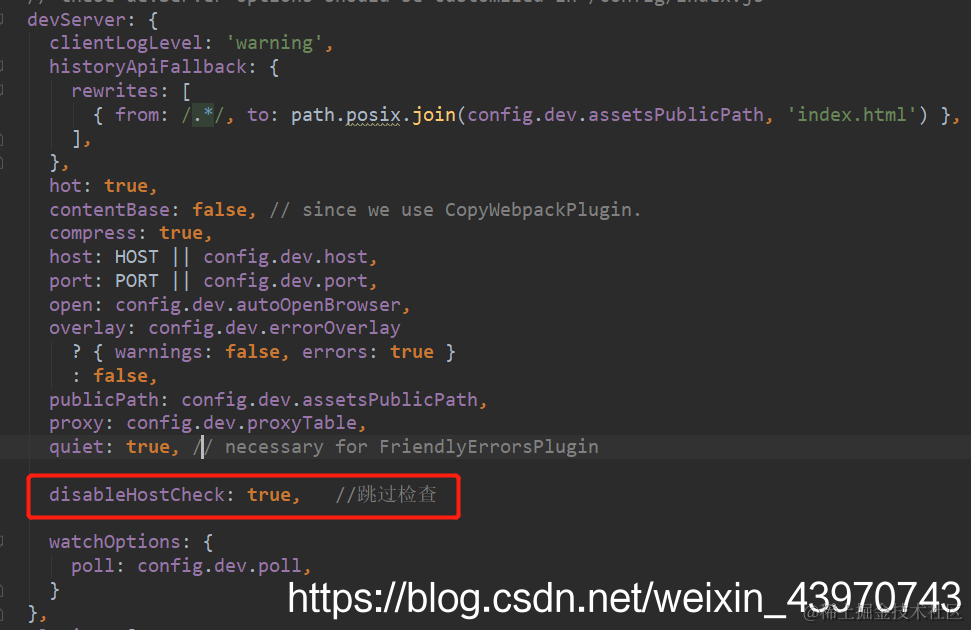 1、在build目录下的webpack.dev.conf.js文件,devServer下添加disableHostCheck: true,跳过检查