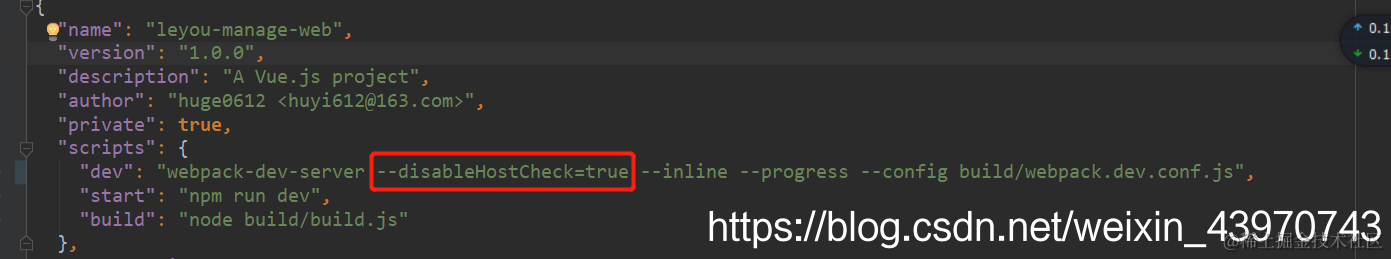 2、同样的原理,可以在package.json文件修改scripts命令:webpack-dev-server --disableHostCheck=true