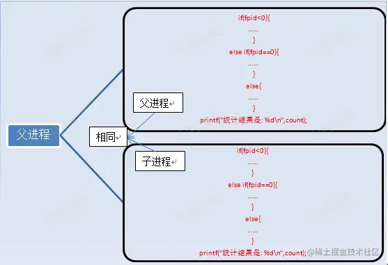 在语句fpid=fork()之前,只有一个进程在执行这段代码,但在这条语句之后,就变成两个进程在执行了,这两个进程的几乎完全相同,将要执行的下一条语句都是if(fpid<0)……