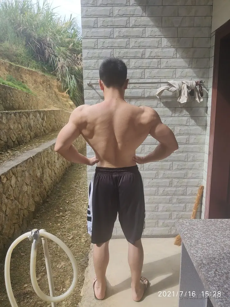 看上去没有充血,训练了一年的状态,三角肌和手臂能看出来一年下来形状出来了,但是胸背因为太宽厚度实在是难长。