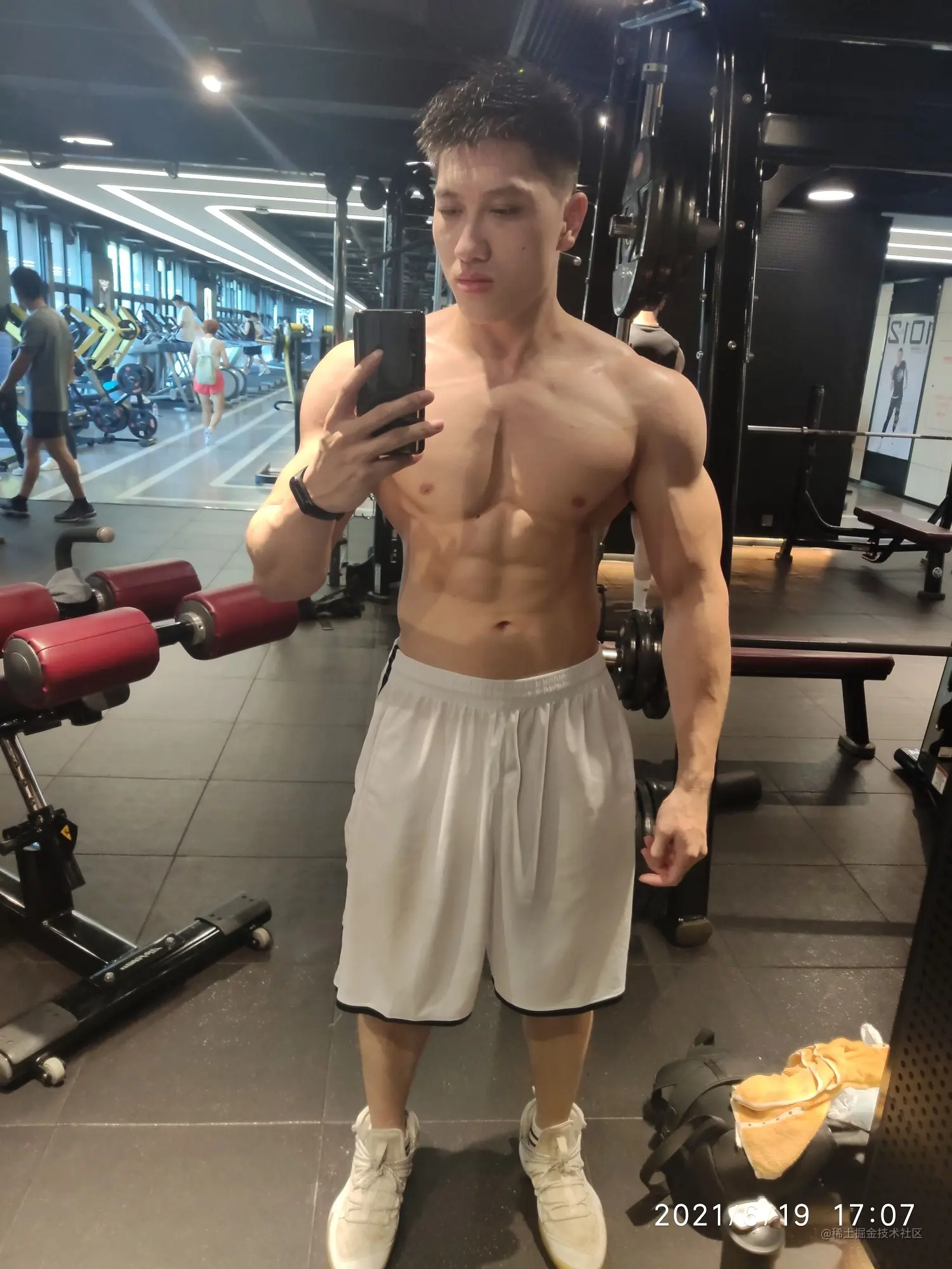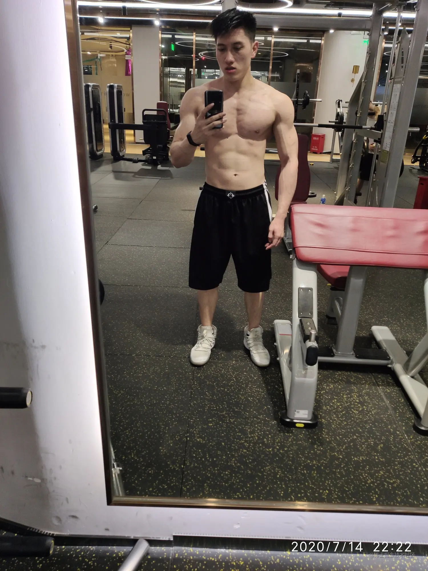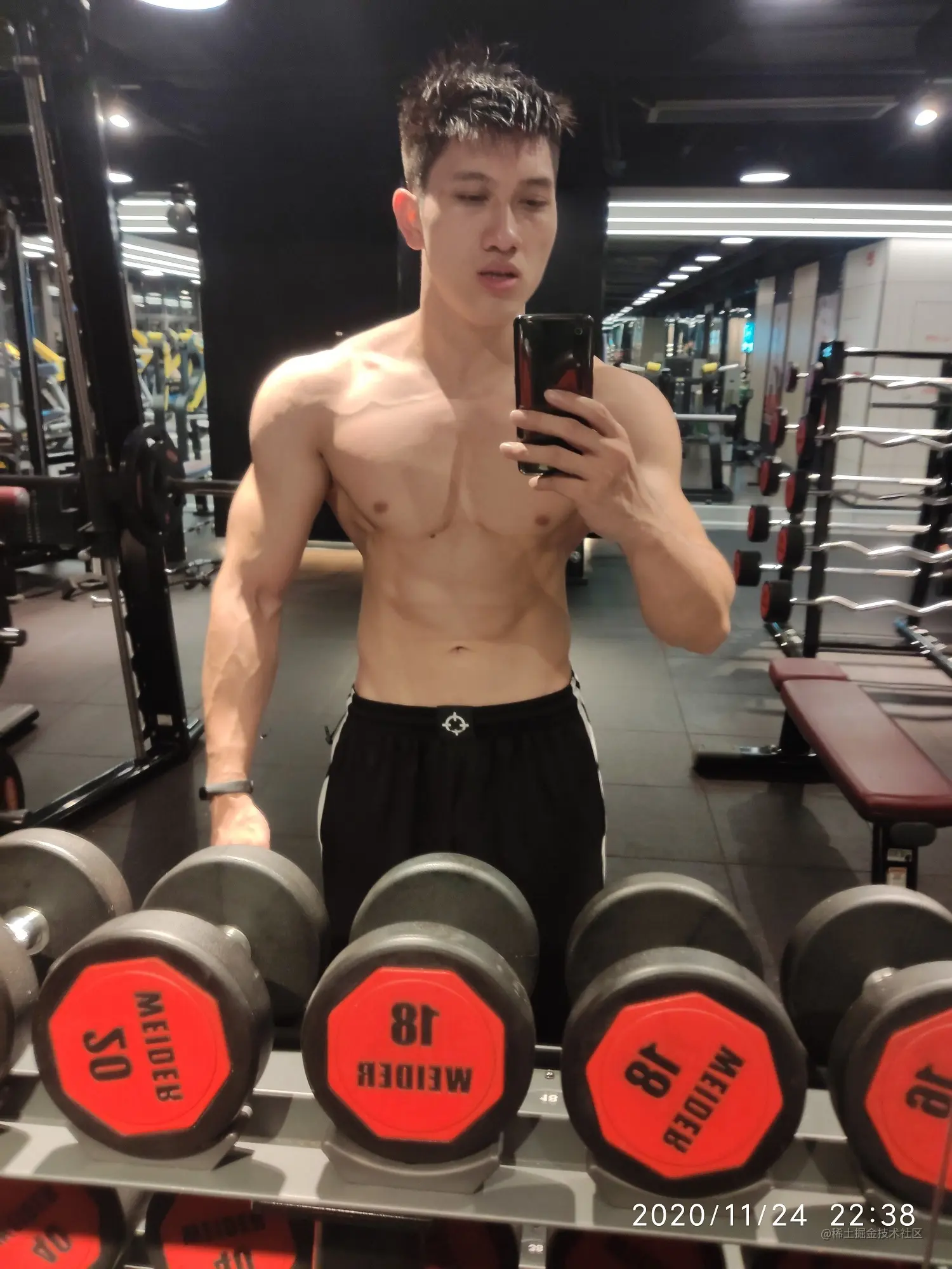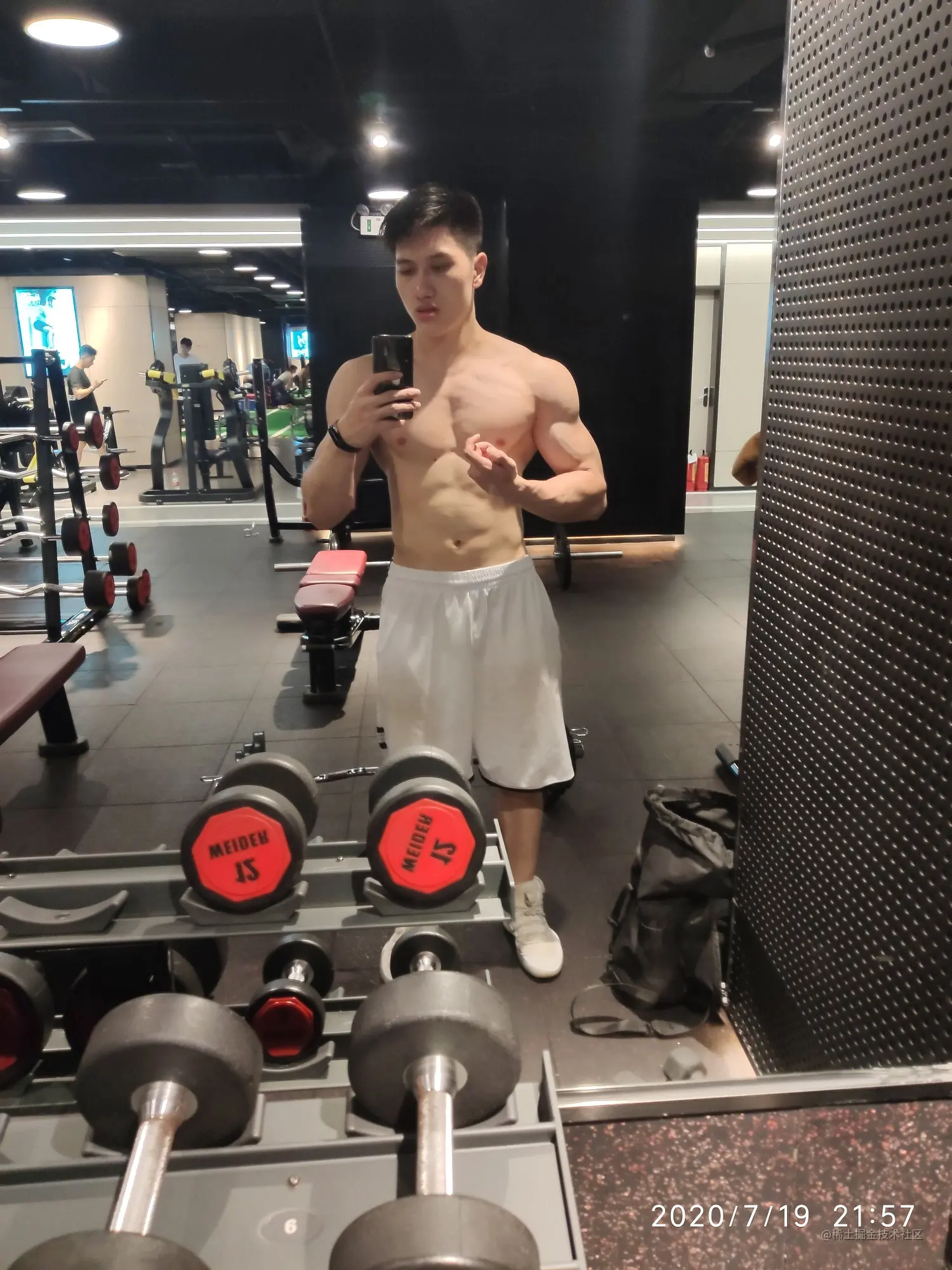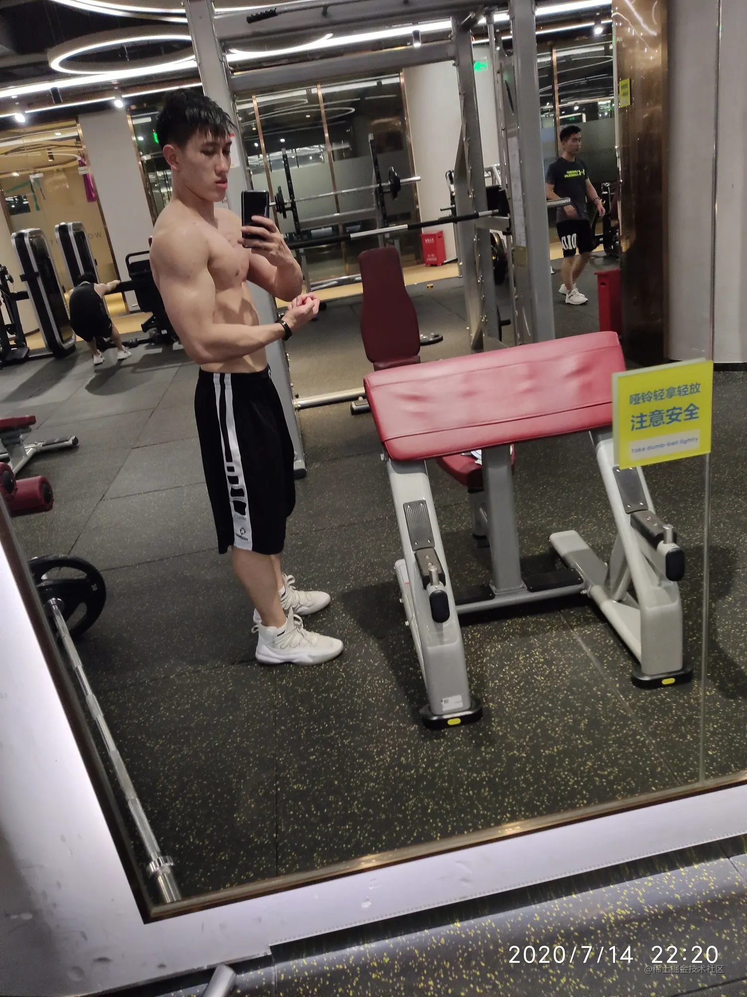 练了一个月效果好像还不错,体重长了2.5kg这样子。健身房拍照一般都有充血,看起来这一天是练了手臂和三角肌。