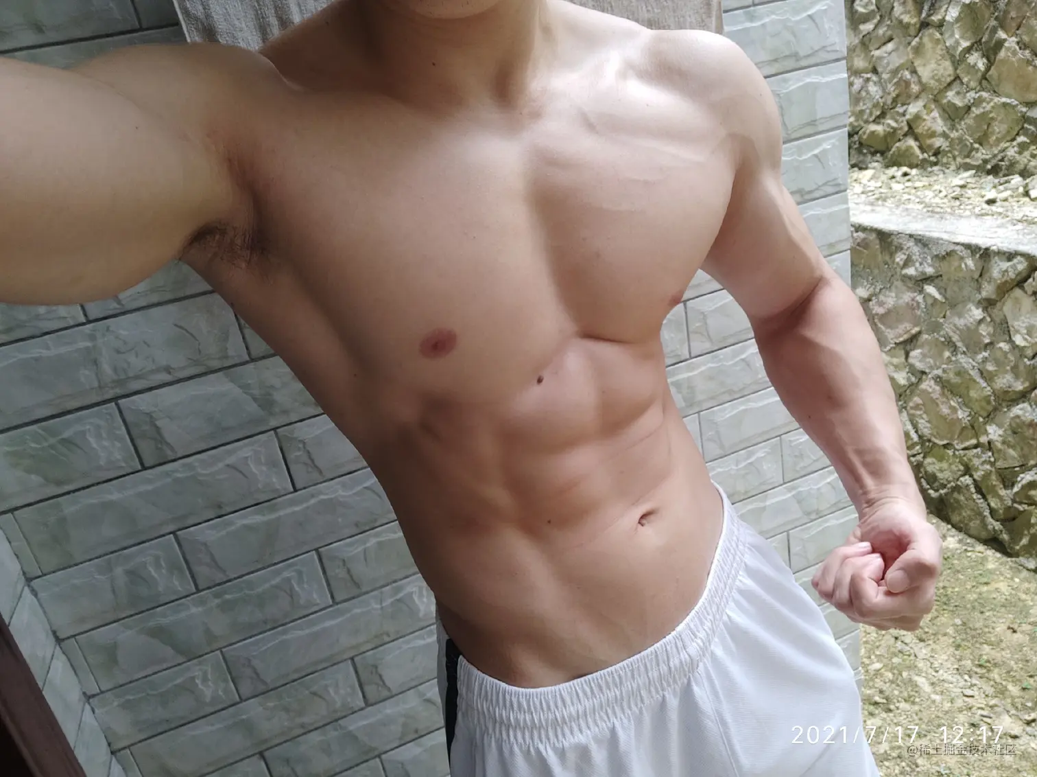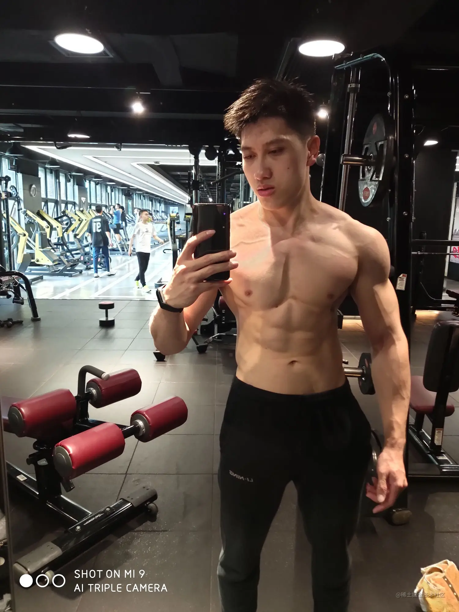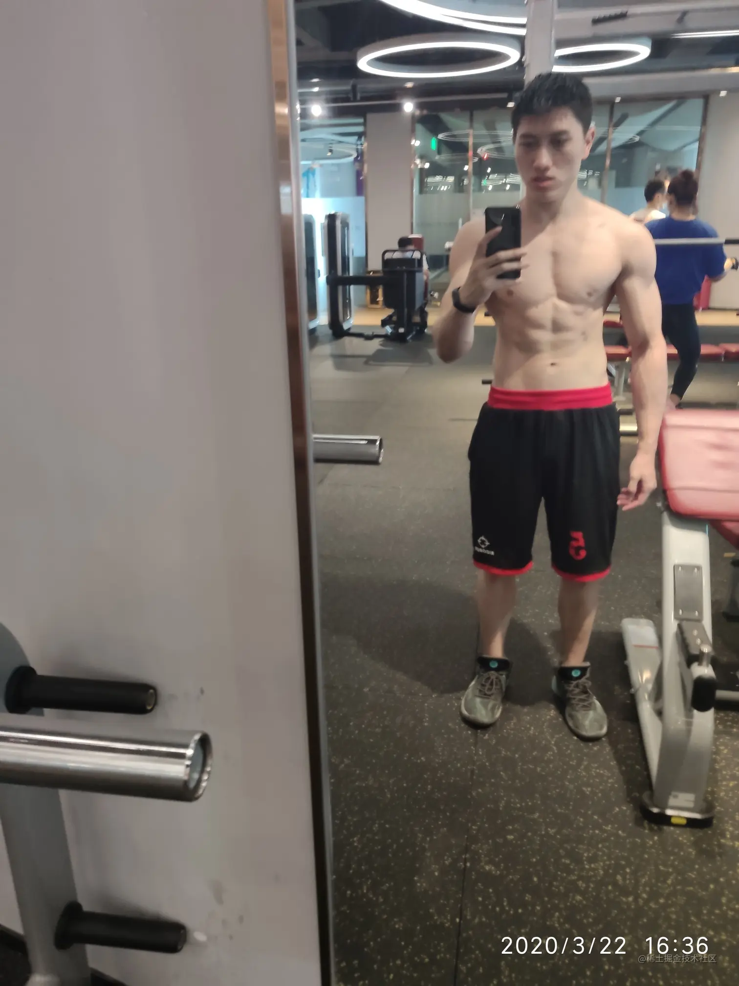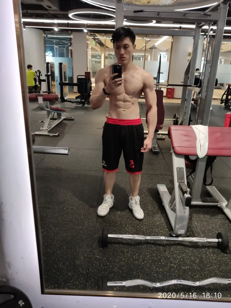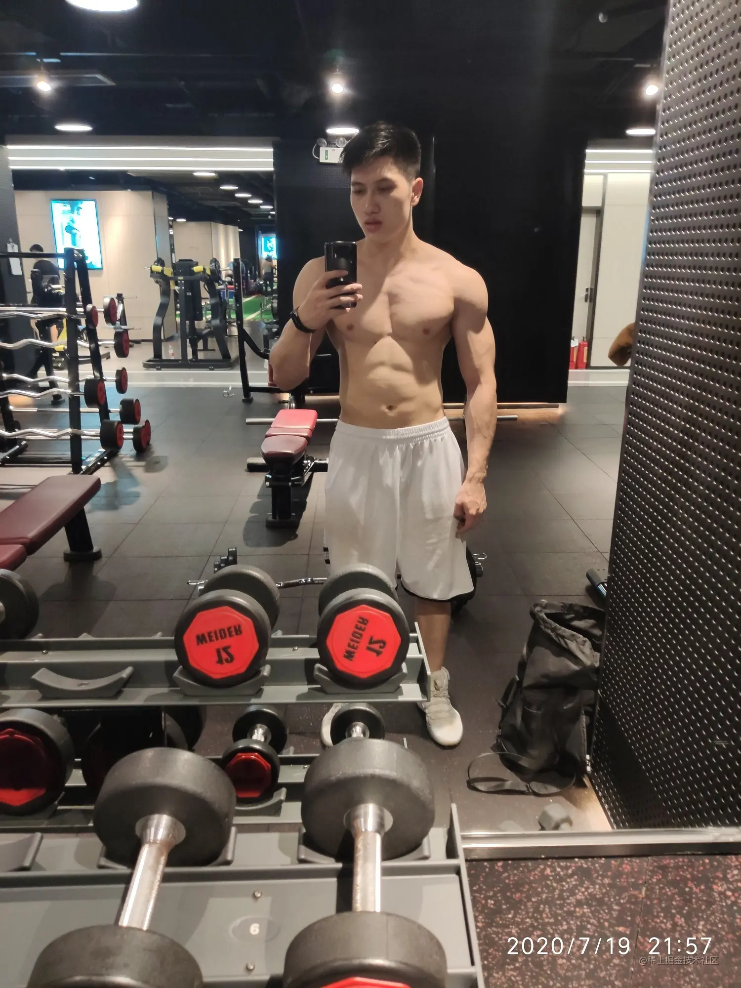 练了一个月效果好像还不错,体重长了2.5kg这样子。健身房拍照一般都有充血,看起来这一天是练了手臂和三角肌。