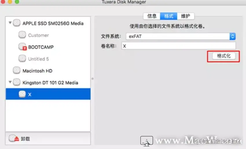 接下来,点击右边的功能面板中的“格式”选项,进入 TuxeraNTFS for mac格式转换功能。