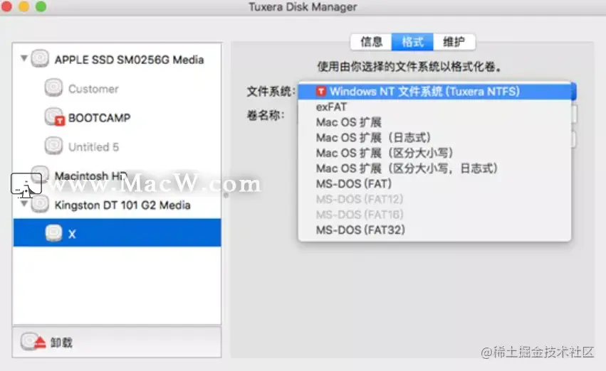 Tuxera NTFS for mac如图所示,提供了各种文件系统格式转换选项,其中包括 NTFS、 exFAT、FAT32。