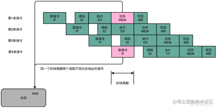 结构冒险本质上是一种硬件冲突,我们以5级流水线为例来说,指令读取IF阶段和取数操作MEM,都需要进行内存数据的读取,然而内存只有一个地址译码器,只能在一个时钟周期里面读取一条数据。