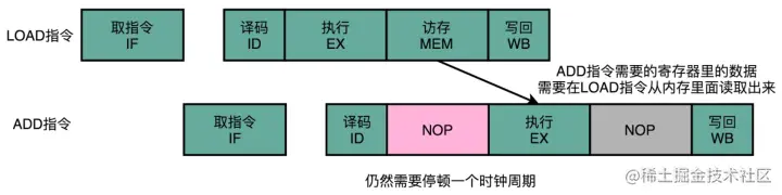 ADD指令不需要等待WB完成再执行EX,而是LOAD指令通过操作数转发直接传给ADD指令,减少了一个NOP操作,只需要1个NOP操作即可,提升了流水线效率。