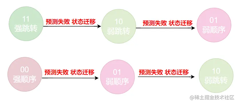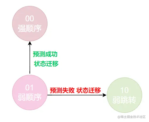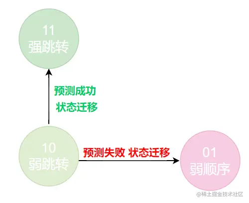 - 当前状态处于01 弱顺序分支时 必然预测下一次也是顺序分支,此时会有两种结果,预测成功了,下一次状态调整为00,预测失败了,最终程序选择了跳转分支,下一次状态变为10。