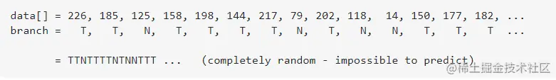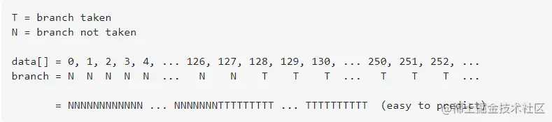 经过前面的一番分析,我们回到stackoverflow那个数组排序和无序耗时的问题上来,这个问题有两个关键因素: