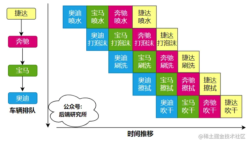 如果是完成所有工序再搞下一辆,这样某个时刻5个工序只有1个在做,其他4共工序都是等待状态,工人们都开始摸鱼了,钱也没赚到,客户等待时间还长。