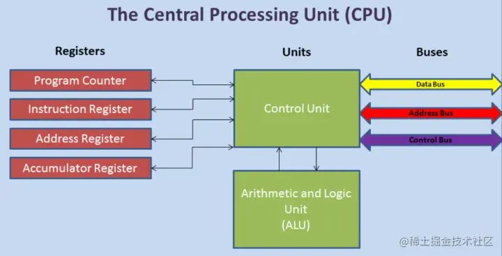 CPU内部的核心组件有各类寄存器、控制单元CU、逻辑运算单元ALU、高速缓存
