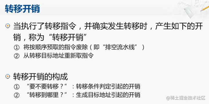 遇到这种指令转移情况,处理器需要先排空指令2和指令3对应的流水线,然后跳转到指令1的新的目标位置进入新的流水线,这部分称为转移开销。