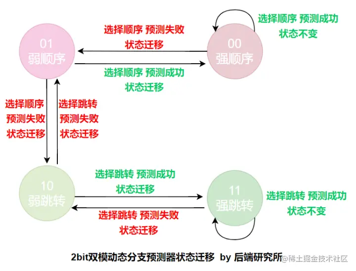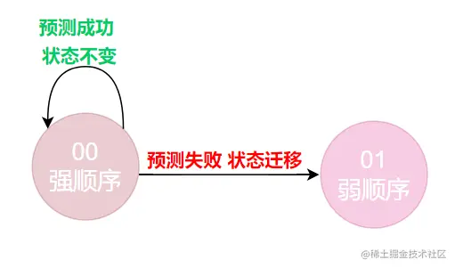 - 当前状态处于00 强顺序分支时 必然预测下一次也是顺序分支,此时会有两种结果,预测成功了,下一次状态仍然是00,预测失败了,最终程序选择了跳转分支,下一次状态变为01。
