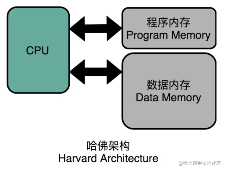 没错,这种将指令和数据分开存储就是著名的哈佛结构Harvard Architecture,指令和数据放在一起的就是冯诺依曼结构(也叫普林斯顿结构Princeton Architecture)。