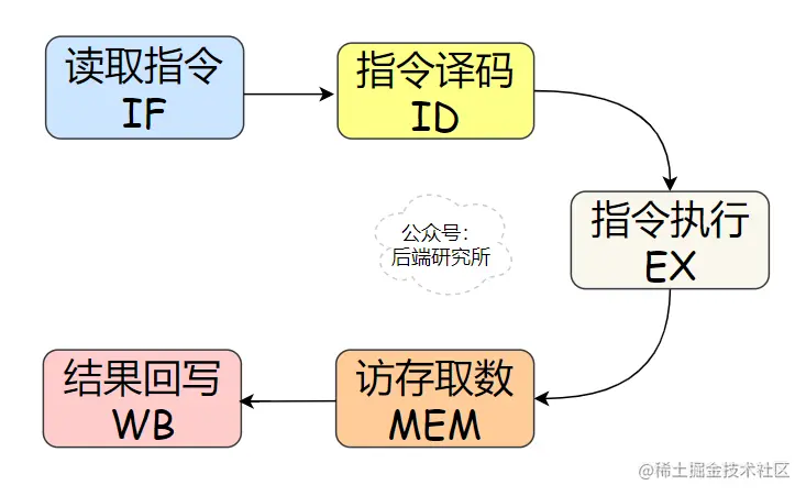 Cpp程序经过编译器处理成机器码来执行,程序会被翻译成一条条的指令Instruction,为了简化问题,我们选择5级流水线的CPU来说明问题: