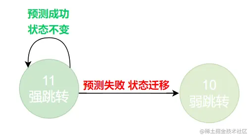 - 当前状态处于11 强跳转分支时 必然预测下一次也是跳转分支,此时会有两种结果,预测成功了,状态不变仍然是11,预测失败了,最终程序选择了顺序分支,下一次状态变为10。