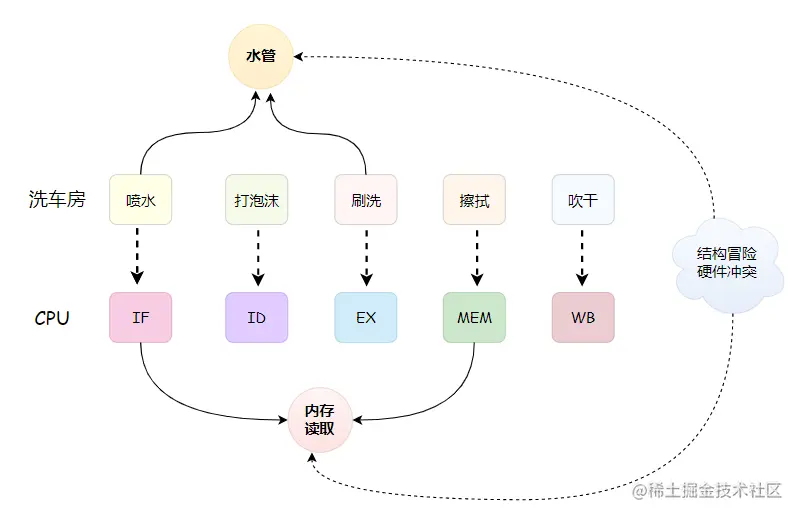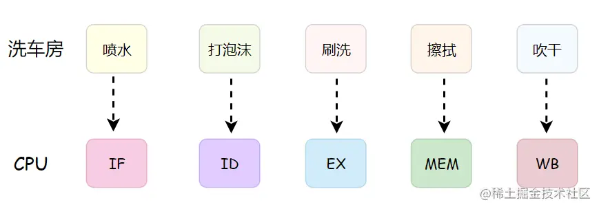 上面的IF、ID、EX、MEM、WB就是CPU的5级流水线,这个流程和洗车房的流水线很相似: