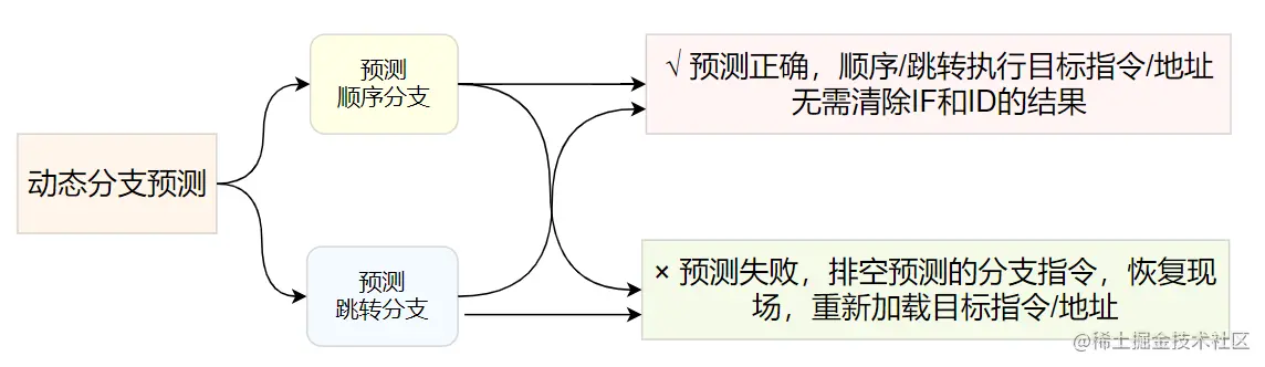 动态分支预测会根据之前的选择情况和正确率来预测当前的情况,做出判断是顺序分支还是跳转分支,因此仍然会有成功和失败两种情况。