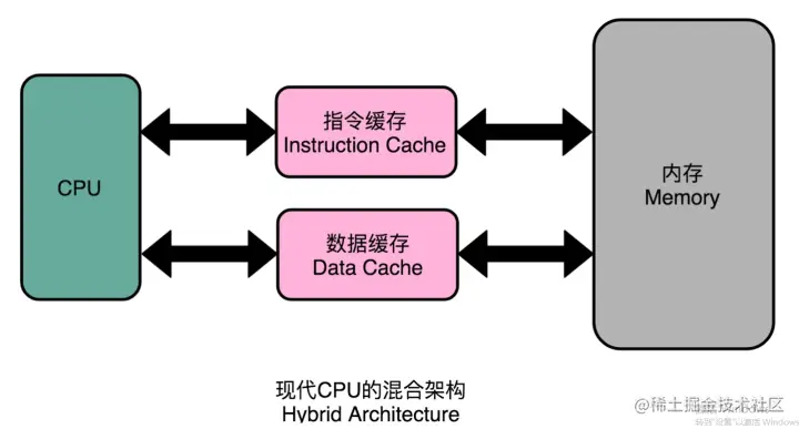 这两种结构都有各自的优缺点,现代的CPU借鉴了两种架构采用一种混合结构,并且引入了高速缓存,来降低CPU和内存的速度不匹配问题,如图: