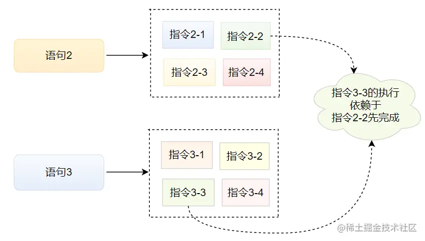 语句3的计算依赖于b的值,在语句2对b进行了计算,也就是语句3依赖于语句2,但是每一个语句都会被翻译成很多的指令,也就是其中两个指令存在依赖关系。