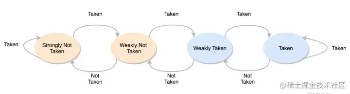 我们继续看2bit动态分支预测是如果进行状态机迁移的: