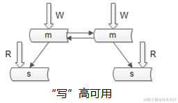 58同城没有使用上述两种方式来保证读写的可用性,我们使用的是 “双主”当“主从”的方式来保证数据库的读写可用性。