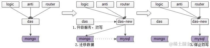 (1)双写法迁移数据的第一步是升级服务,原来的服务是写一个库,现在建立新的数据库,双写。比如底层存储介质的变化,我们原来是mongo数据库,现在建立好新的mysql数据库,然后对服务的所有写接口进行双库写升级。