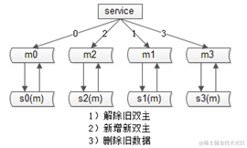 第二个步骤修改配置,此时扩容完成,原来是2个分片,修改配置后变成4个分片,这个过程没有数据的迁移。原来偶数的那一部分现在变成了两个部分,一部分是0,一部分是2,奇数的部分现在变成1和3。0库和2库没有数据冲突,只是扩容之后在短时间内双主的可用性这个特性丢失掉了。