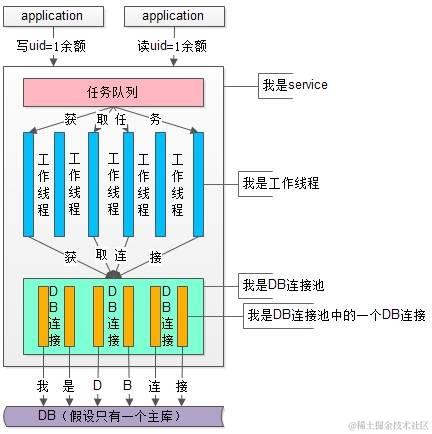(1)service的上游是多个业务应用,上游发起请求对同一个数据并发的进行读写操作,上例中并发进行了一个uid=1的余额修改(写)操作与uid=1的余额查询(读)操作