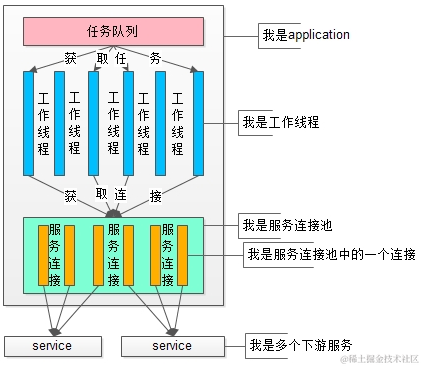 (3.2)中间是工作线程,每个工作线程完成实际的工作任务,典型的工作任务是通过数据库连接池读写数据库