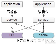 1)请求A发起一个写操作,第一步淘汰了cache,然后这个请求因为各种原因在服务层卡住了(进行大量的业务逻辑计算,例如计算了1秒钟),如上图步骤1