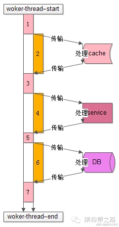 2)而2,4,6步骤中【上图中橙色时间轴】,访问cache、service、DB过程中线程处于一个等待结果的状态,不需要占用 CPU,进一步的分解,这个“等待结果”的时间共分为三部分: