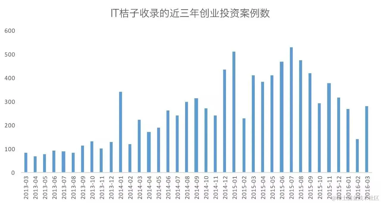 我们抓取了IT桔子上近3年来融资事件的数量变化进行对比。可以发现出现招聘需求异常的5到7月是创业融资案例数迅速攀升的时候,7月份融资案例数达到顶峰。