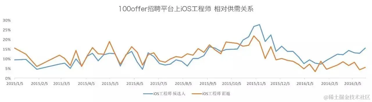 iOS在2015年10月份开始就有了明显过剩。虽说iOS作为移动端职位,基本情况跟Android类似,但是培训班实在是提供了过量的入门级iOS,极大影响了市场供需。
