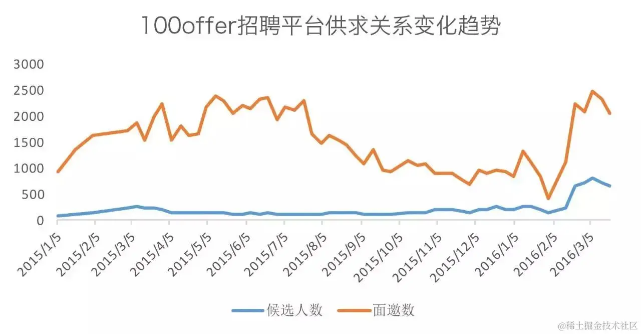 上方图中橙色线条描述的是企业发放面邀数的趋势,是企业招聘需求的数据表现。我们可以看到面邀数据高峰是在5到7月,这跟我们通常的理解不同——通常招聘市场在3月最活跃,然后缓慢降温。