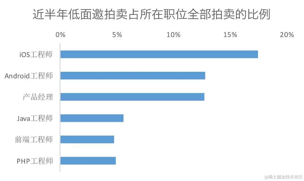 我们统计了各主流职位下候选人拿到低面邀数(<2)的比例,发现iOS高举榜首,有17%的工程师在拍卖中拿到很少的面邀。安卓与产品经理紧随其后,而前端以及Java、PHP等后端语言均控制在合理范围内。