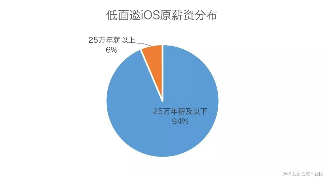 如果深入探究以上低面邀的候选人,就会发现收到低面邀的人群以初级候选人为主。以iOS为例,我们以原年薪25万为界来看薪资分布,会发现94%的低面邀iOS候选人年薪在25万以下。