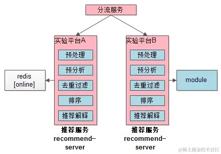 分流服务,它是推荐系统中一个非常有特色也非常重要的一个服务,它的作用是将上游过来的请求,按照不同的策略,以不同的比例,分流到不同的推荐算法实验平台(也就是下游的推荐内核)中去。