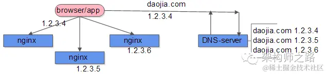 DNS-server部分,一个域名可以配置多个IP,每次DNS解析请求,轮询返回不同的IP,就能实现nginx的水平扩展,扩充负载均衡层的整体性能。