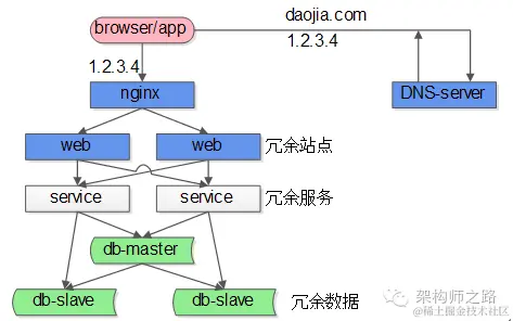 在这个互联网架构中,站点层、服务层、数据库的从库都可以通过冗余的方式来保证高可用,但至少