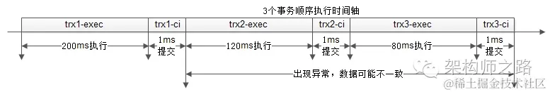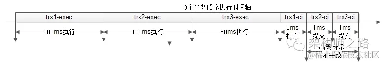 一个事务,分成执行与提交两个阶段,执行的时间其实是很长的,而commit的执行其实是很快的,于是整个执行过程的时间轴如下: