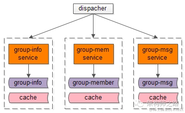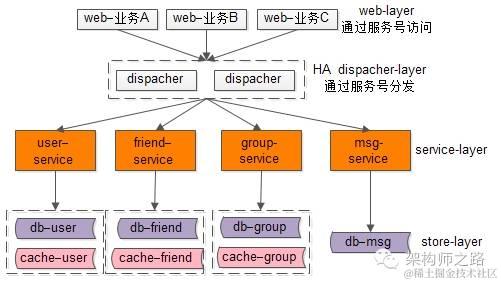 如果所有的信息存储都在一个service里,那么一个地方出bug,就将影响整个业务,所以更合理的做法是在服务层进行细分,架构如何细分?垂直拆分是个好的方案,将子业务一个个拆出来,那么微信的服务化架构或许会变成这个样子: