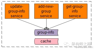 最粗犷的玩法,所有基础数据的访问,都通过一个service访问,在业务不是特别复杂的时候还好,一旦业务变复杂了,这个service层会变得非常重,成为耦合点之一,以微信场景为例,假设有一个通用的服务层来访问基础数据,这个服务层可能是这样的: