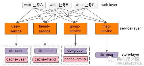 这样的话,一个service出问题也不会影响其他service,同时数据层也按照业务垂直拆分开了。